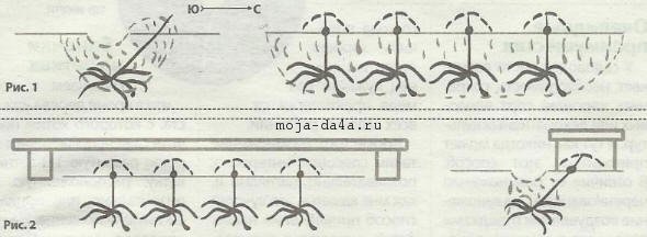 С южной стороны ряда делаю канавку для полива так, чтобы влага просачивалась на нижнюю почку. Слежу за тем, чтобы почва в ней была постоянно влажной, регулярно поливаю только теплой водой с последующим рыхлением. На этом посадка закончена, осталось притенить верхние глазки под : холмиками. Это нужно для того, чтобы дольше оттянуть время пробуждения верхних глазков, чтобы быстрее начали образовываться корни, поэтому и поливать их нужно теплой водой, желательно дождевой.Для притенения беру половинки кирпичей и кладу их по краям ряда с черенками, а на них — подходящий по длине кусок доски.