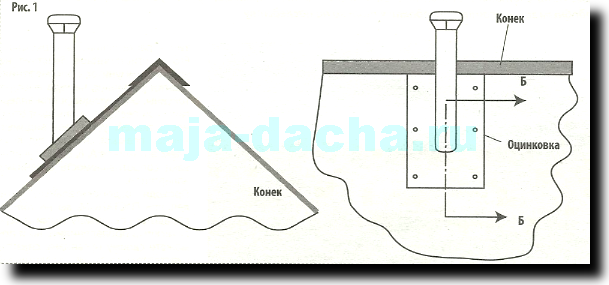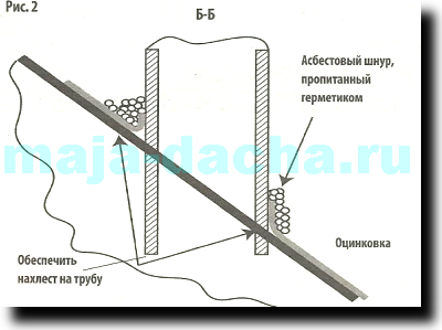 При использовании на дачах металлической трубы в качестве дымохода многие сталкиваются с проблемой герметизации при проходе ее через скат крыши. Вот проверенный на практике вариант решения. На выведенную трубу надевается фартук из оцинкованного железа. Отверстие под трубу в «оцинковке» делается чуть меньше контура от косого «среза» трубы, и края завальцовываются киянкой вверх (см. рис. 1). После закрепления фартука на скате крыши берется асбестовый шнур. Им обматывается место стыка (15-20 витков). Через каждые 2-3 витка шнур пропитывается высокотемпературным силиконовым герметиком (температура эксплуатации от -65° до +200°) (см. рис. 2).