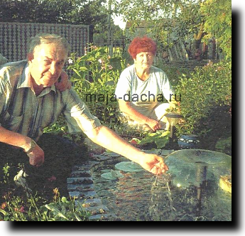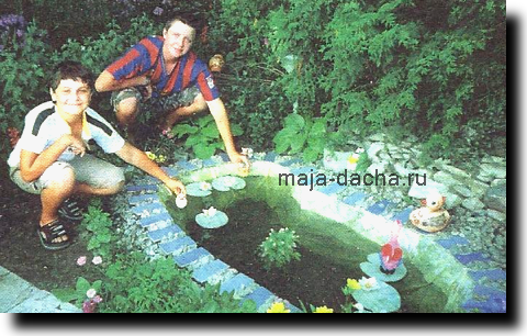 Таков был первый печальный опыт. Но мысль о водоеме не покидала. Я начала все обдумывать, подготавливать материалы. И делала это втайне от мужа — решила преподнести ему сюрприз. Действительно: покуда он на работе, я на даче одна и времени у меня достаточно. Для нового водоема выбрала место под туей, в полутени, рядом с дорожкой, ведущей к беседке. Яму выкопала в форме фасолины. Земля у нас песчаная, копать было совсем нетрудно. Землю складывала в кучу под тую, потом положила камни — получилась небольшая альпийская горка, которая красиво заполнила пустоту под деревом.