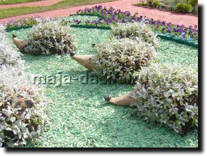 Вот мне ещё ёжики понравились. Самое главное делать легко — Для того чтобы сделать ежика понадобится пустая пластиковая бутыль, но подойдут и 3х-, 2х- литровые бутылки. Мордочку будущего ежика обтяните колготами или мешковиной, приклейте глазки, сделайте нос. Наполните ежика землей и посадите для имитации иголочек нетребовательные растения — очитки, молочай кипарисовый, гвоздику серовато-голубую, ясколку. Из декоративных трав — газонная трава, овсяница сизая. А некоторые сажают даже кактусы!