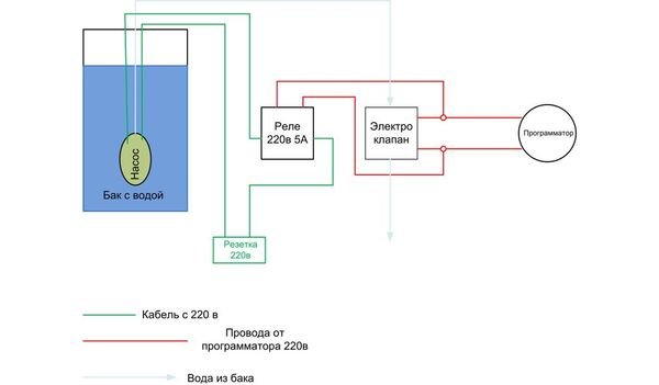 Сигнал с программатора поступает на электро-клапан, параллельно ему срабатывает реле, которое в свою очередь запускает насос. Данная схема была опробована на протяжении 3-4х лет и доказала свою работоспособность и живучесть, кроме того она предельно проста и воплотить ее в жизнь сможет практически каждый.
