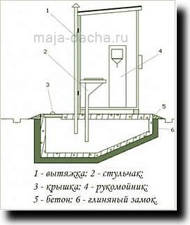 Рассмотрим устройство данных туалетов. По сути, такой туалет представляет из себя обычный деревянный туалет с выгребной ямой. Глубина выгребной ямы минимум 1 метр. Для удобства очистки таких туалетов дно делают под уклоном к люку. Чтобы полностью изолировать землю от попадания нечистот дно и стены ямы дачного туалета делают из кирпича или из бетона.