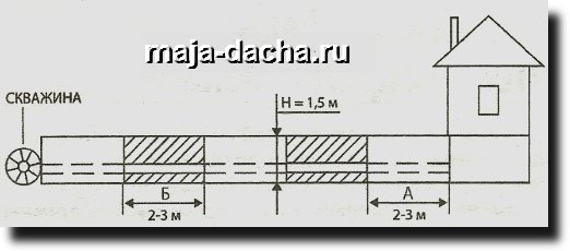 Как малой кровью прокопать 30 м траншеи от скважины до дома. При выполнении этой работы необходимо учесть максимальную глубину промерзания грунта в вашем регионе. В условиях Подмосковья, где, видимо, находится дача, это до 1,5-1,7 м от уровня земли. На эту глубину, а то и больше, и надо закладывать трубу. Есть несколько вариантов на выбор.
