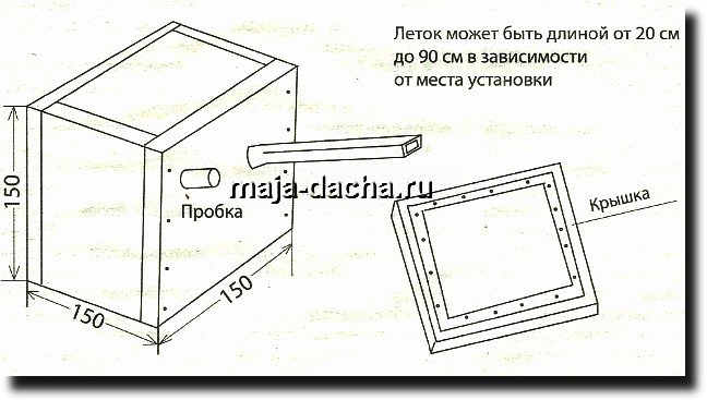 Два или три шмелевни-ка можно установить под землей. Для входа и выхода шмелей в этом случае делают трубочки длиной 80-90 см из деревянных реек толщиной 10 мм. Четыре рейки сколачивают так, чтобы размер отверстия был 18×18 мм. Деревянная трубка плотно крепится к летку.