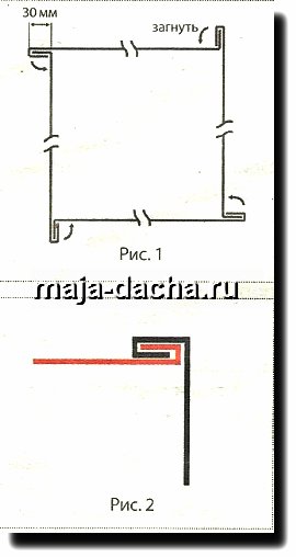 Для начала берем кровельное (оцинкованное) железо и вырезаем 4 листа 790×1100 мм. В плане коптильня будет 700×700 мм, а 90 мм припуска нам нужны для соединения всех листов в один корпус. Соединяем листы методом, которым соединяют железо при покрытии крыш. Характер соединения показан на рис. 1 и 2, долго останавливаться на нем не буду. Если железо потолще, корпус можно сделать сварной.