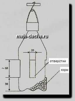 Предлагаю схему кормушки из пластиковой бутылки. К сожалению, доступ к корму здесь одинаков как для синиц, так и для воробьев…
