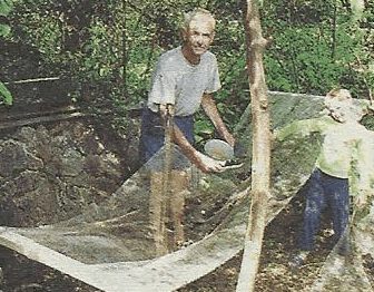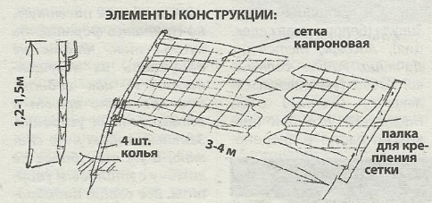 Дача у нас расположена на южном склоне, в свое время сделали на участке шесть террас, посадили яблони, груши, абрикосы, шелковицу, кизил. А как собирать плоды? Хочу предложить нехитрое приспособление для сбора урожая.Закупил я в строительном магазине обыкновенную широкую (1,5 м) капроновую сетку, которую используют при штукатурке стен. Сделал из кольев четыре стойки высотой 1,2-1,5 м из дерева. К сетке прикрепил две поперечные палки-перемычки таким образом, чтобы их концы с двух сторон были по длине больше ширины сетки на 100-150 мм. Вот и все!