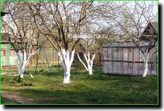 В садовой литературе рекомендуется белить деревья осенью и дополнительно подбеливать в конце зимы. Тогда не будет солнечных ожогов коры, морозобоин. Также рекомендуется утаптывать снег вокруг деревьев после снегопадов, чтобы уберечь деревья от погрызов мышами. Все это совершенно правильно и может быть легко сделано, если у вас сад возле дома, а вы в этом доме живете постоянно.