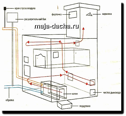 В поддувало вставлен поддон из листового железа для золы, выполненный в виде корыта.Дымоходы не перегораживаются, постепенно поднимаясь вверх. Вниз они нигде опускаться не должны, чтобы топливо сгорало полностью. Объем начального сгорания должен быть как можно больше. Выход из печи имеет высоту 25 см.