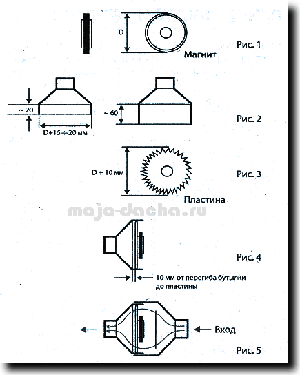 Теперь — за работу. Сначала разбираем динамик и извлекаем магнит (рис. 1). Далее обрезаем бутылки на разной высоте (рис. 2). Затем обрезаем консервную крышку-пластину, вырезая по всему диаметру уголки-усики высотой 15-18 мм (рис. 3). Подогнув уголки, вставляем пластину в короткую часть бутылки (с натягом) и устанавливаем на нее магнит (дополнительно можно проклеить, рис. 4). Надеваем другую обрезанную бутылку (предварительно можно смазать клеем, а сверху обмотать по стыку клейкой лентой (рис. 5)).