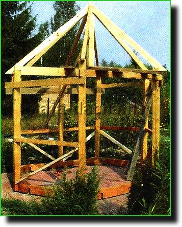 Крыша. У беседки крыша, как правило, — шатровая и по существу — самонесущая. Если работать в одиночку, то поднимать сразу готовые сектора трудно. Поэтому проще делать крышу со стропилами, для установки которых потребуется опора в центре шатра.