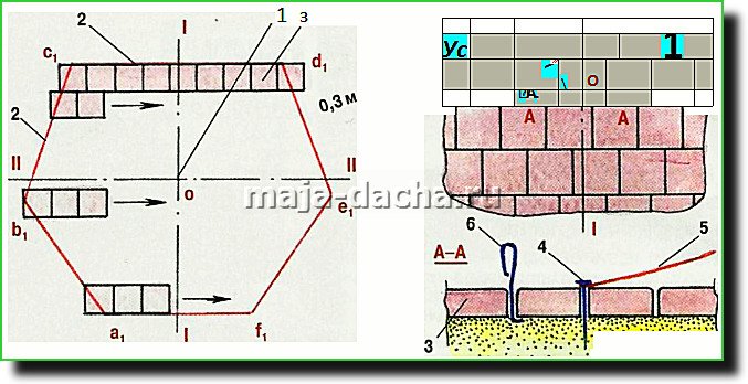 При подходе к центру колышек убираем и натягиваем шнуры I-I и Геометрический центр основания переносим на уложенную плитку, после чего её вынимаем и сверлим сквозное отверстие 04-5 мм. Вынимать плитку удобно проволочным крючком.