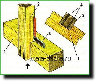 Теперь можно приступать к изготовлению и монтажу стоек. В рассматриваемом случае стойки — из бруса сечением 100×100 мм, а их основание — из бруса сечением 150×150 мм (рис. 8). Соединение стойки с основанием — врезкой. В торцах стоек сделаны пропилы для забивки туда берёзовых клиньев, смазанных клеем. Стойку с основанием соединяем саморезами, под которые следует предварительно просверлить отверстия.
