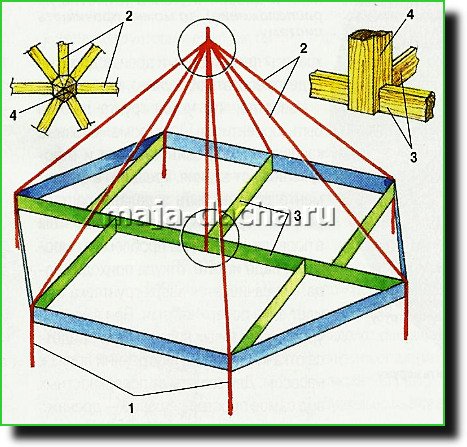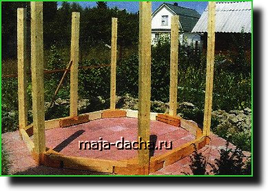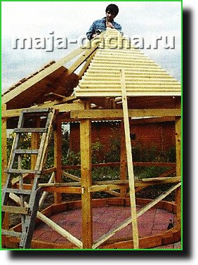 Крыша. У беседки крыша, как правило, — шатровая и по существу — самонесущая. Если работать в одиночку, то поднимать сразу готовые сектора трудно. Поэтому проще делать крышу со стропилами, для установки которых потребуется опора в центре шатра.