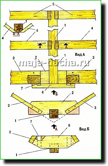 Дальнейшие действия такие. На середину прогона be устанавливаем опорный столбик из бруса сечением 100×100 мм с выбранным снизу пазом. На верхней части столба делаем 7 граней (по количеству стропил) (рис. 12).