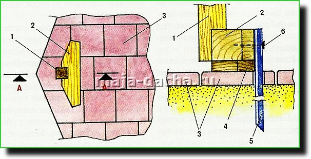 Рис. 10. Крепление основания стойки к грунту: 1 — стойка; 2 — колода основания; 3 — плитка; 4 — защитная подкладка; 5 — штырь; 6 — саморез.