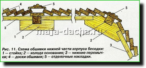 Тогда же можно приступать и к отделке нижней части беседки. В рассматриваемом случае постройка обшита обрезными строгаными досками внахлёст {рис. 11). Такое оформление — дешёвое, практичное, а благодаря рельефной фактуре красиво смотрится.