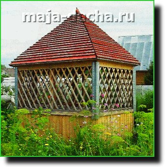 Что касается отделки различных зон беседки, то здесь у каждого свои вкусы. Особенно если речь идёт о цветовой гамме отделки. Хотя чаще здесь преобладают два цвета: один — для крыши, другой — для корпуса беседки. Важно, чтобы крыша беседки гармонировала с другими постройками на участке.