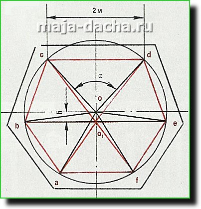 Дальнейшие построения можно сделать уже описанным способом. Таким образом, в результате разметки получаем контур беседки в натуральную величину и два центра: геометрический — для построения беседки — и условный — для возведения крыши.