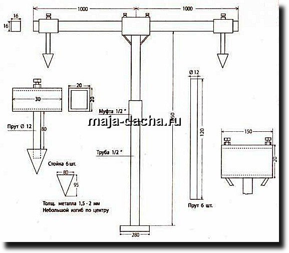 Схема маркера — Т-образная. Главная особенность — возможность регулировать положение ползунковых стоек-зубьев на любую ширину. Таких стоек может быть несколько, шести — вполне достаточно, чтобы делать борозды под все огородные культуры. Думаю, тот, кто сделает такой маркер, досадовать на мою схему не будет.