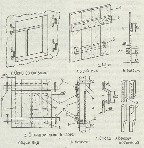 1 — щит из досок, 2 — брус крепящий, 3 -брус опорный, 4 — доска, скрепляющая щит, 5 — скобы металлические, 6 — рама оконная Т-образная, 7 — стекло оконное 8 — подоконник, 9 — стена дома.