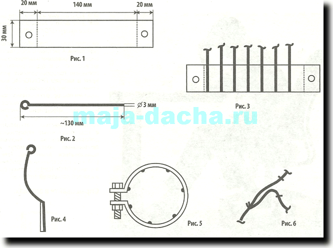 Дальше сгибаем пластину в кольцо (рис. 5) приваренными прутками внутрь и соединяем концы болтом. Затем в каждую из петель продеваем веревку и связываем, чтоб получилась не скользящая петля (рис. 6). Всю конструкцию монтируем на шест, и можно идти в сад по урожай.