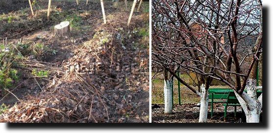 Вечнозеленые кустарники укрывают мешковиной и поливают растения в сухую безморозную погоду. Чтобы ветви хвойников не сломались под тяжестью снега, их подвязывают к стволу или периодически отряхивают от избытка снежного покрова. Еще одна зимняя опасность, грозящая плодовым деревьям во время заморозков – это повреждение древесины. Чередование ночного морозца с солнечной дневной погодой таит в себе серьезную опасность – появление морозобоин. Древесный ствол с южной стороны за день прогревается, и ночные заморозки могут превратить сок растения в острые кристаллы, разрывающие древесину на клеточном уровне. Стволы деревьев на зиму красят известью, при необходимости укутывая соломой.