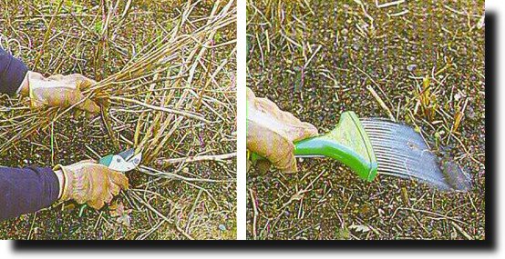 Побеги травянистых многолетников укорачивают до 15 см над уровнем грунта и мульчируют хорошим слоем земли с добавлением зрелого навоза, торфа или листьями. Сверху укладывают плотную проволочную сетку. Луковичные растения так же мульчируют слоем компоста и укрывают опавшей листвой. Под кусты плетистых роз вносят слой земли (не менее 30 см), смешанный с компостом. Наружные побеги укрывают соломой и мешковиной. Кустарниковые и чайногибридные сорта роз так же окапывают унавоженной землей, утепляя основания побегов листвой, и укрывают лапником.